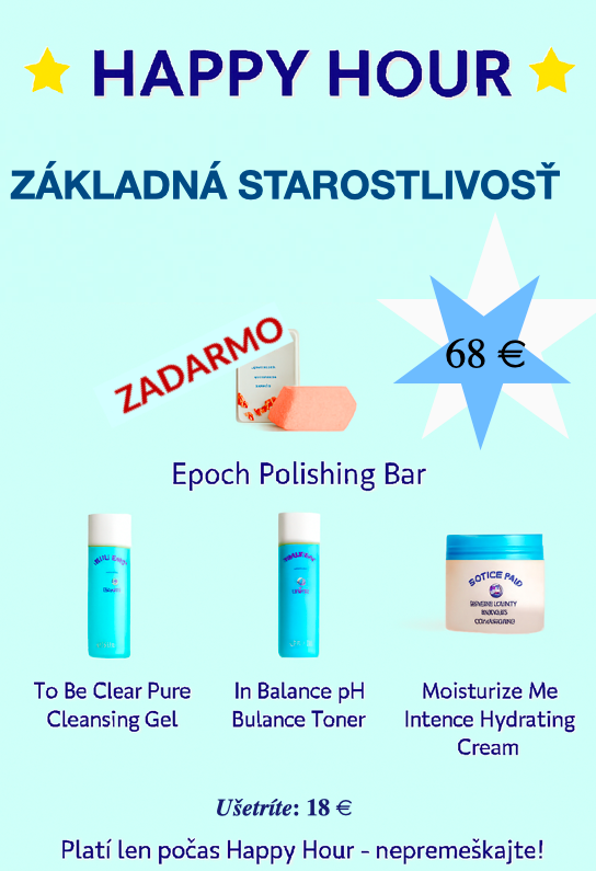 Nezmeškaj túto jedinečnú príležitosť. Happy Hour je čas, kedy sa krása stretáva s výhodou – a ty si jej hlavnou hviezdou. Vyber si svoj balík, dopraj si rozmaznávanie a uži si darčeky, ktoré ti spravia deň krajším.